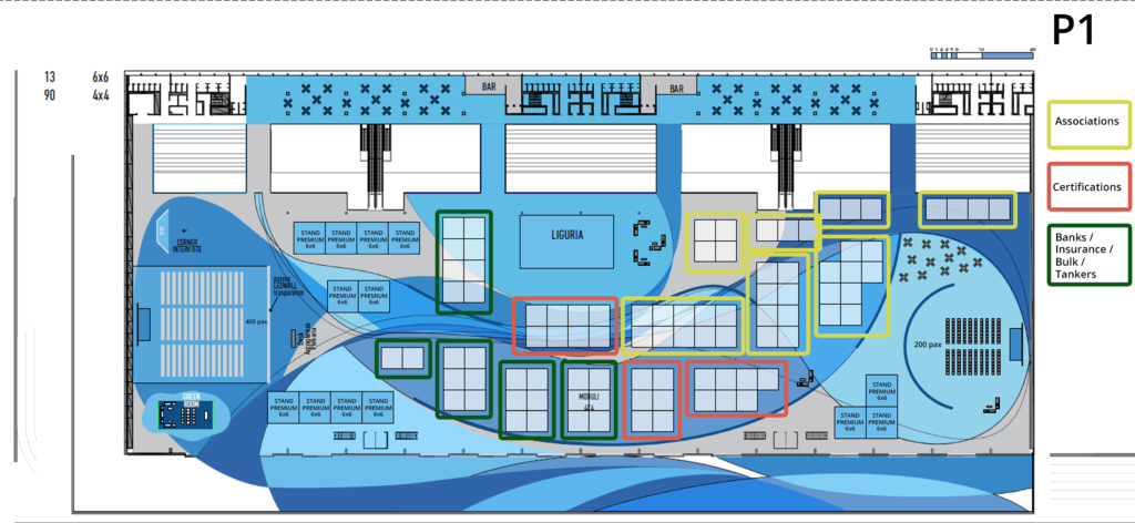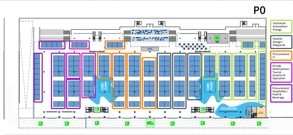 The ground floor hosts 200 booths and lounge areas. The mezzanine houses the refreshment area and private rooms. The first floor includes two conference room, a networking area with lounges available for private appointments, an additional exhibition area and an arena for presentations.